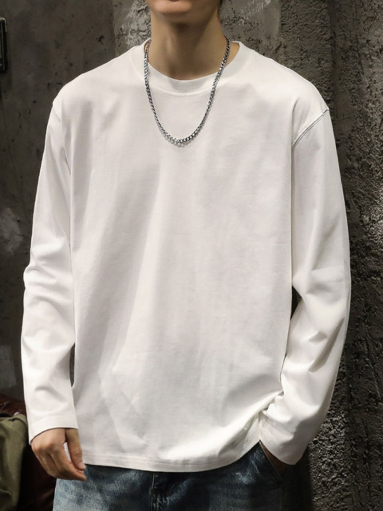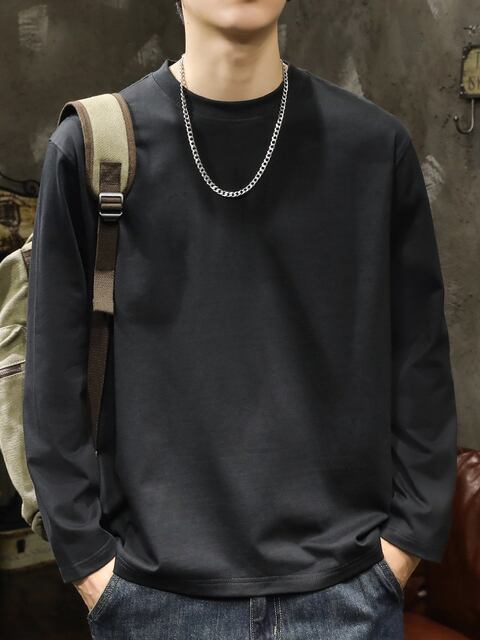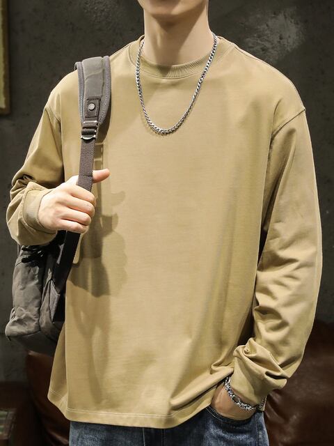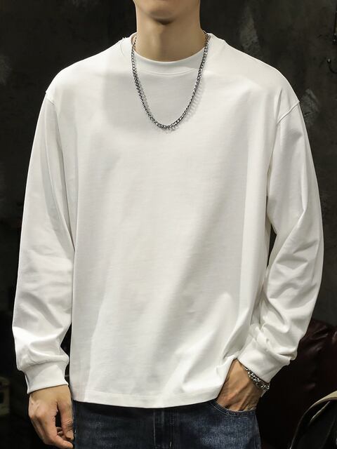 メンズ用ホワイト長袖Tシャツ、春秋のベースレイヤー、メンズクルーネックスウェットシャツ