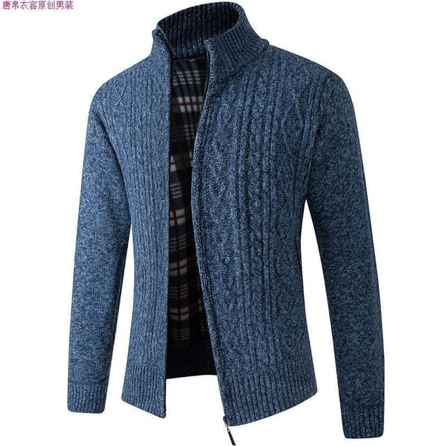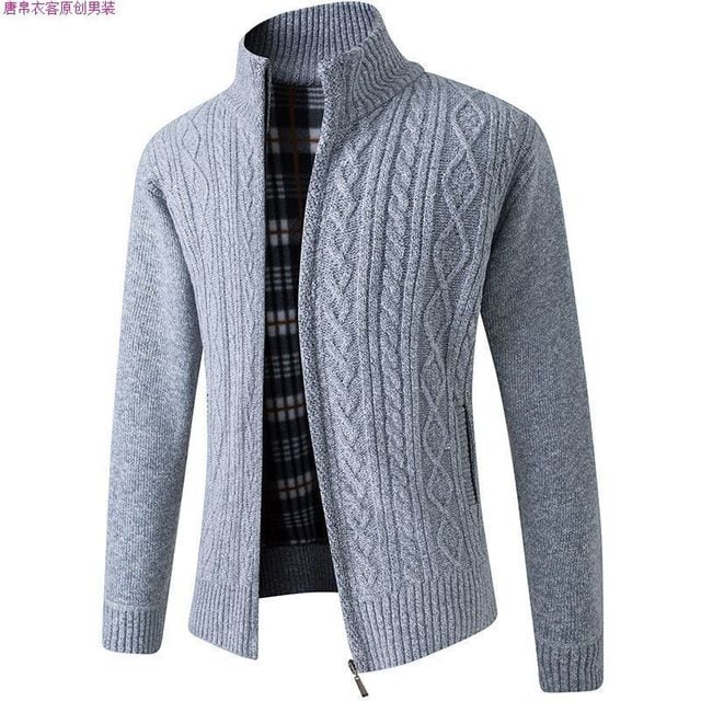 新しい秋冬メンズカジュアルセーター、フリース裏地、厚手、スタンドカラー、ゆったりとした無地ニットウェア、暖かいコート、トレンディ。