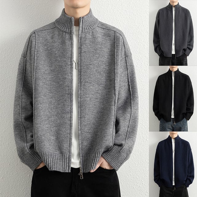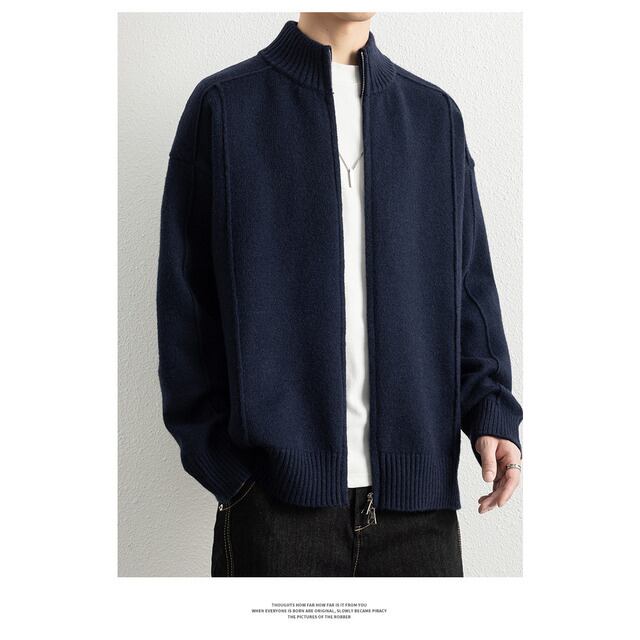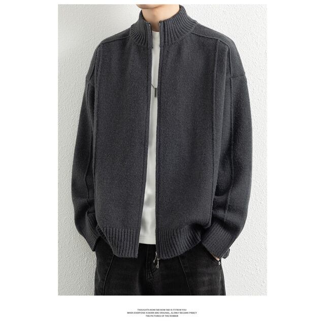 メンズのシンプルなスタンドカラーニットジャケット、新しい秋冬スタイル、質感のあるパッチワーク、男性用の無地のトレンドブランドトップス。